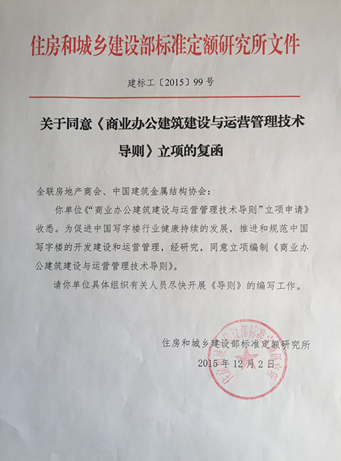 为进一步促进中国商业办公行业健康持续发展,推进和规范中国商业办公的开发建设和运营管理,根据住房和城乡建设部标准定额研究所关于同意《商业办公建筑建设与运营管理技术导则》立项的批复文件(建标工[2015]99号)的精神,组织启动《商业办公建筑建设与运营管理技术导则》编写工作,讨论课题组组成人员及结构,确定各工作组工作方向及阶段性目标。